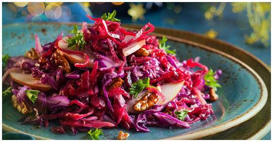Radieschen waschen, putzen und in feine Scheiben schneiden • Apfel waschen, entkernen und in dünne Scheiben schneiden • Koriander waschen und trocken schütteln, dann die Blätter abzupfen • Rotkohl, Zwiebel, Apfel und Radieschen auf einem Teller anrichten.