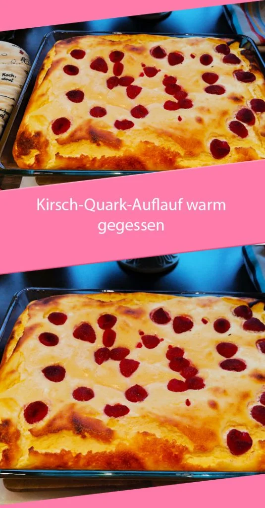 - Die Quarkmasse in eine eingefettete Form kippen und die Kirschen gleichmäßig oben verteilen. Für 25-30 Minuten auf der mittleren Schiene backen.