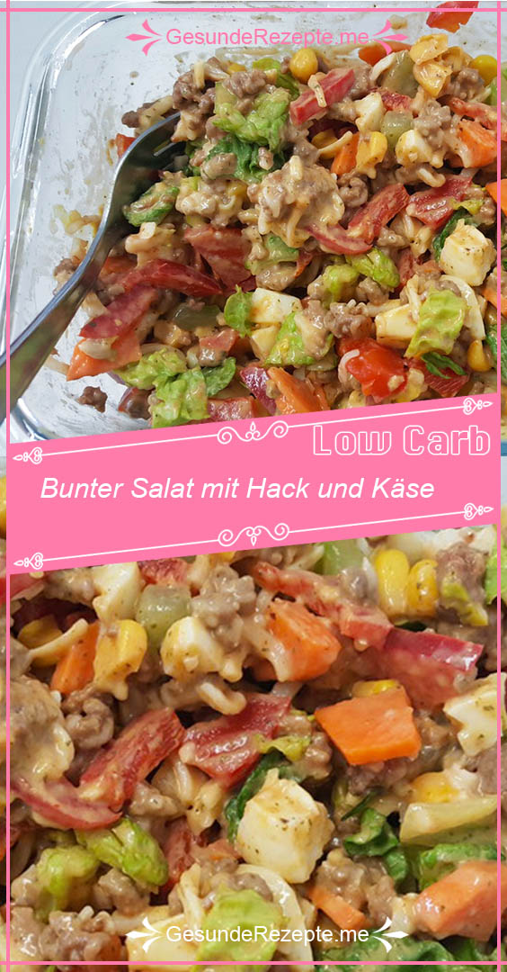 Das Eiweiß in Würfel schneiden und mit dem Mais mischen. Das restliche Gemüse waschen und nach Belieben in Scheiben, Streifen oder Würfel schneiden. Das zerkleinerte Gemüse mit Ei, Hack und Mais mischen. Den Käse darüberstreuen und mit dem Dressing vermengen.