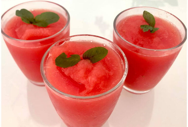 Zutaten: Zubereitung: Schneiden Sie die Wassermelone in Stücke und entfernen Sie die Schale. Legen Sie die Wassermelonenstücke gleichmäßig auf einem Tablett aus und frieren Sie sie für mindestens 4 Stunden oder über Nacht ein, bis sie fest sind.Geben Sie die ...