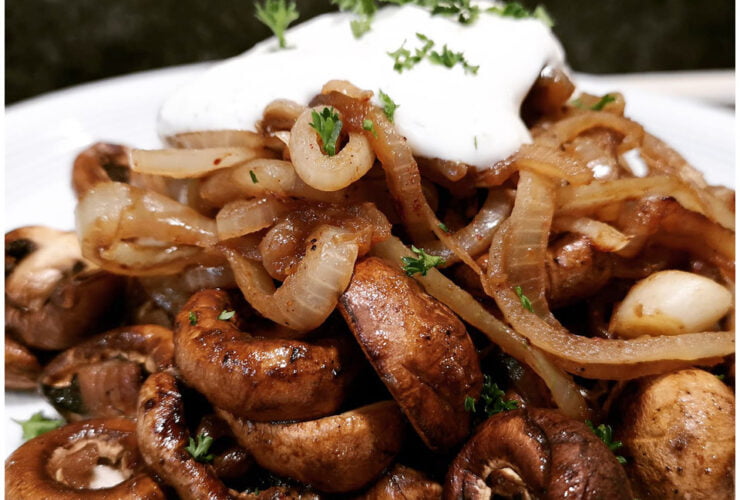 Zutaten: Zubereitung: Die Champignonköpfe von jeder Seite ohne Öl in einer Pfanne auf hoher Hitze anbraten, dann die Hitze reduzieren.Die Zwiebeln mit etwas Olivenöl zusammen mit den Champignons in die Pfanne geben und braten, bis sie weich sind. Mit Salz ...