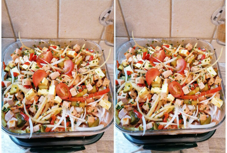 Zutaten: Zubereitung: Lyoner, Emmentaler, Zwiebel, rote Paprika und saure Essiggurken in mundgerechte Stücke schneiden, am besten mit dem Nicer Dicer für eine gleichmäßige Größe.In einer Schüssel Essig, Öl, mittelscharfen Senf und Erythrit nach Geschmack vermengen, um ein leckeres Dressing zu ...