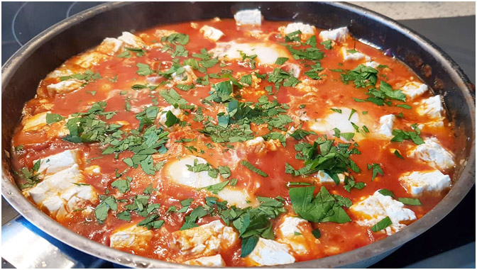 Jetzt mit einem Esslöffel 4 Mulden für die Eier in die Tomatenmasse drücken und jeweils ein Ei hineinschlagen. Feta würfelig schneiden und drüber streuen. Deckel auflegen und ca. 5 Minuten weiter köcheln lassen. Das Ei soll innen noch leicht flüssig sein.