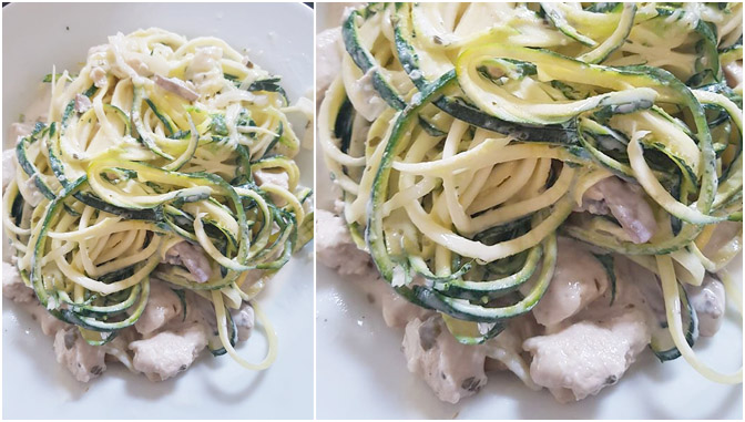 Zucchini Nudeln mit Hähnchengeschnetzeltem.
