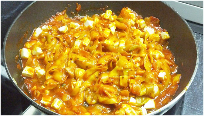 Ich habe zwei Zucchini geschält und ebenfalls mit dem Sparschäler ‚Bandnudeln‘ abschneiden/schälen.Diese dann in etwas Olivenöl in einer Pfanne leicht anbraten.Nebenbei die Tomatensauce machen.Ich hab Tomatenmark mit Pfeffer,Salz und etwas Frischkäse gewürzt,etwas wasser dazu und das dann mit in die Pfanne.Mit frischen Tomaten schmeckts sicher auch super lecker!