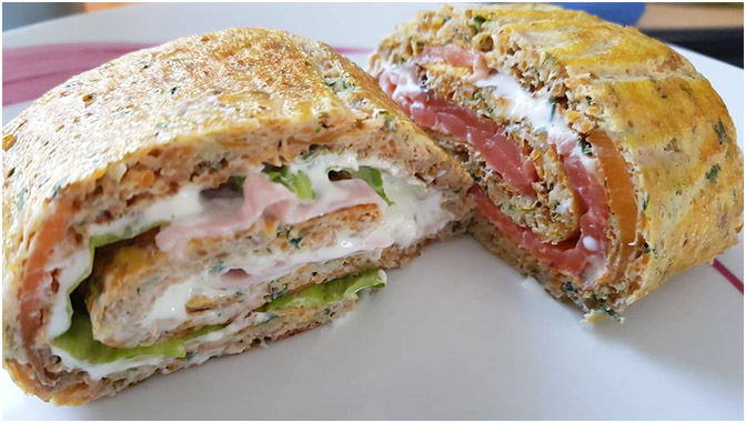 Auf den etwas abgekühlten Teig geben, Salat und Schinken drauf einrollen, fertig.