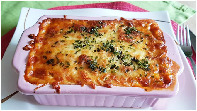 Zucchinilasagne mit gratiniertem Schafskäse.