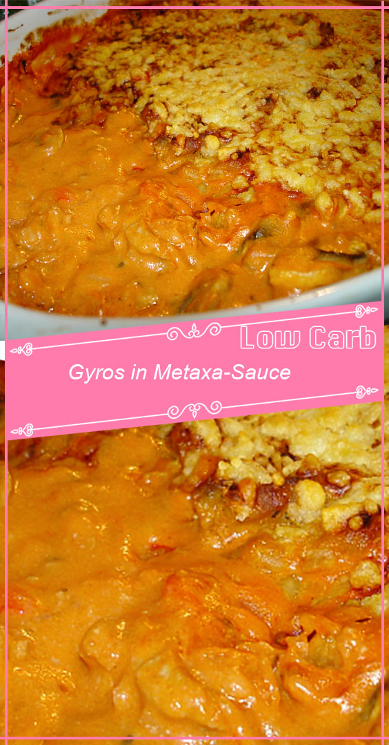 Nun die passierten Tomaten mit dem Frischkäse oder Schmand verquirlen und mit Salz, Pfeffer würzen. Die Soße zum Pfanneninhalt geben und alles gut miteinander vermengen. Das Gyros in Metaxa-Sauce abschmecken und in eine Auflaufform geben. Dann mit Reibekäse bestreuen.