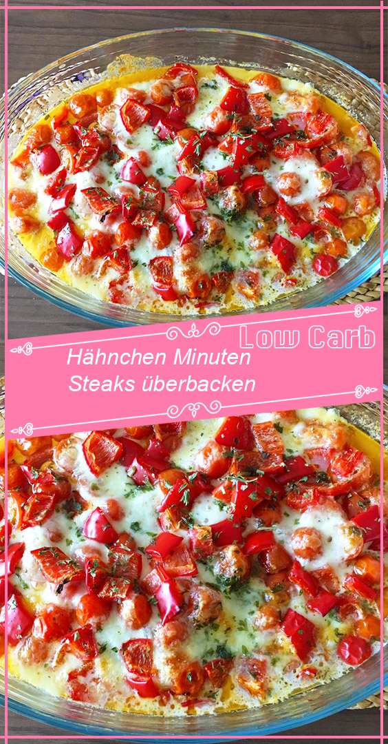 Fleisch würzen und mit etwas Öl anbraten. In eine Auflaufform geben und mit den geschnittenen Tomaten und Mozzarella bedecken und ganz zum Schluss die Paprikawürfel und Petersilie darüber.