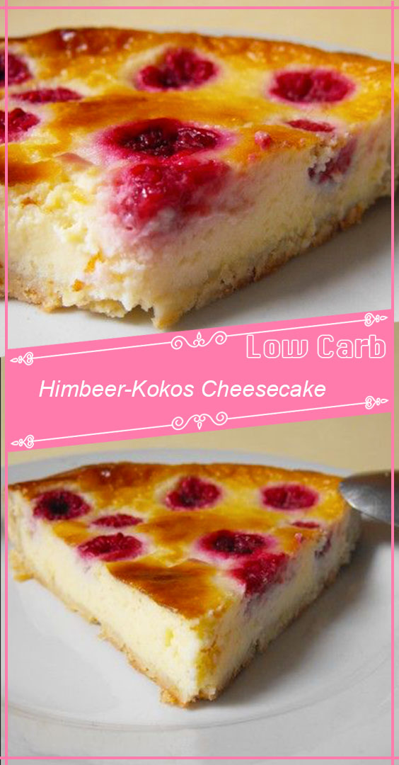 Die Käsemasse auf dem Kokosboden verteilen. Die aufgetauten Himbeeren gut abtropfen lassen und leicht zerdrücken (wenn sie sehr sauer sind leicht süßen). Löffelweise auf den Belag geben und diesen damit marmorieren.