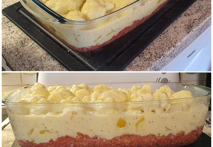 ZUTATEN: 1 Blumenkohl 500g Hackfleisch 1 Zwiebel Etwas Sauce Hollandaise 100g geriebener Gouda ZUBEREITUNG: Blumenkohl putzen und in Röschen teilen. Anschließend ca. 15 Minuten im Salzwasser garen. In der Zwischenzeit das Hackfleisch mit gewürfelter Zwiebel krümelig braten. ...