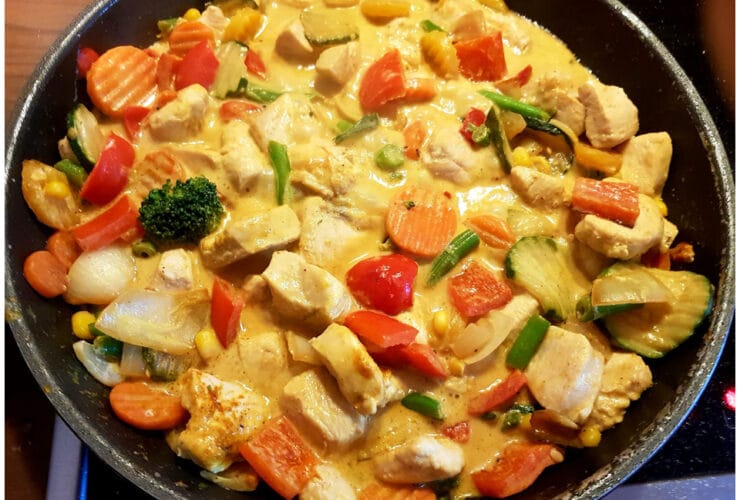 ZUTATEN: 600 g Putenbrust 200 ml Kokosmilch 400 g Erbsen mit Möhren (TK) etwas Butterschmalz n. B. Gemüsebrühe, instant Pfeffer Salz Currypulver Basilikum, gemahlener Sternanis, gemahlener ZUBEREITUNG: Die Putenbrust in Streifen schneiden und in heißem Butterschmalz anbraten. Haben die Putenstreifen ...