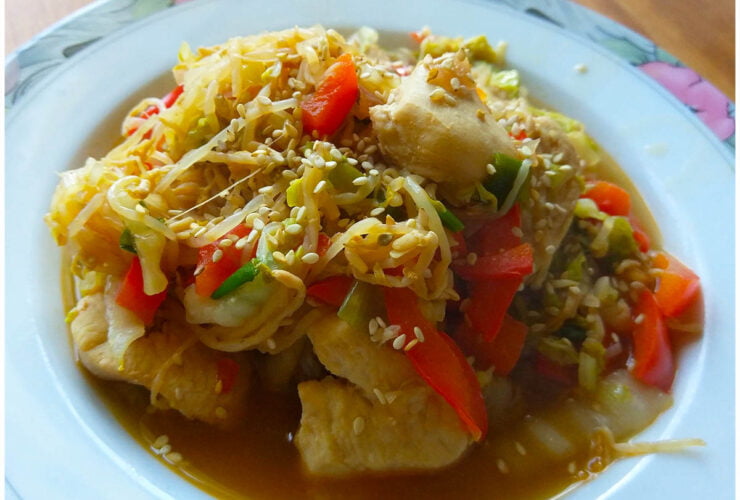 ZUTATEN: 2 Hühnerbrüste 1 kleine rote Paprika, 1/2 Chinakohl, 2 Karotten, 3-4 Frühlingszwiebel, 1 Zwiebel, 1-2 Knoblauchzehen, ( optional Sojasprossen), Sojasoße, Sesamöl, Etwas gemahlenen Ingwer, Salz, Chili oder Chinagewürz, ZUBEREITUNG: Ich habe zum Schluss noch ein wenig Austernsoße dazu gegeben, ...