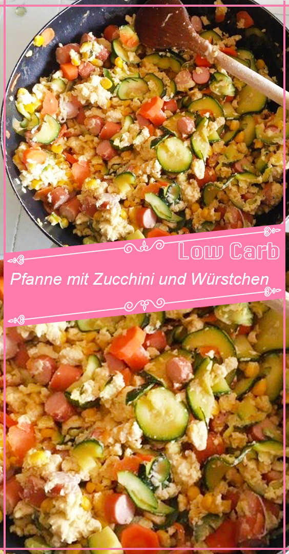 Etwas Butter in eine Pfanne geben und die Zucchini, Karotten, Würstchen und optional Mais darin 1 bis 2 Minuten anbraten. Erst danach würzen, die Eier in die Pfanne schlagen und gut vermischen.