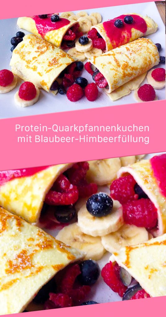 Ich habe für die Füllung etwas Quark mit Schoko-Whey(ca. 10 g )angerührt und von den zweiten die TK – Beeren im Mixer mit etwas Stevia und Mandelmilch gemixt. Die beiden fertigen Pfannenkuchen dann dünn damit bestreichen, in die Mitte ein paar Blaubeeren und Himbeeren legen und zusammenrollen.