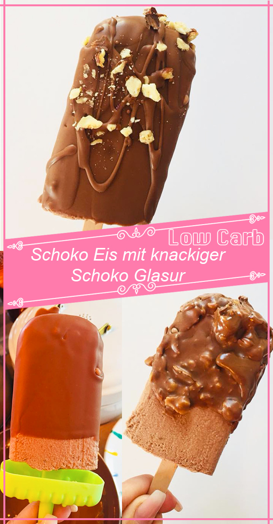 Den Schlagobers/Sahne steif schlagen und die flüssige Schokoladenmischung unter ständigem rühren unter die Sahne rühren. Backkakao unterrühren (hier kann auch mehr als 2 TL genommen werden, je nach gewünschter Farbintensität) Die Masse in Eisförmchen füllen und im Tiefkühler für 24 Stunden einfrieren. Für die Glasur die Schokolade und das Kokosfett zusammen unter ständigem rühren über dem Wasserbad schmelzen. Die Eisformen aus dem TK nehmen und kurz unter heißem Wasser halten damit man das Eis aus der Form bekommt. Dann das Eis in die Schokolade tunken oder mit einem Löffel über das Eis gießen und auf einen Teller zum trocknen legen, das geht seht schnell. Ich habe ein paar Eis nur mit Schokolade glasiert und bei einigen habe ich gehackte Haselnüsse unter die Schokolade gerührt und dann getunkt. Man kann natürlich auch die Glasur weglassen. Anschließend wenn die Schokolade fest ist (das geht sehr schnell da sie sofort am Eis anfriert) einzeln in Gefrierbeutel geben und gut verschließen, dann sofort wieder einfrieren. Jetzt haben wir einen kleinen „Brikkerl“ Vorrat Sollte es dir wie mir gehen und du hast noch ein paar andere Eis am Stiel im Tiefkühler und daher keine Griffe für deine Formen, gibts einen kleinen Tipp am letzten Foto! Die Holzstäbe habe ich günstig über Amazon bestellt und sie können auch ein paar mal wiederverwendet werden. Weitere Eis Rezepte folgen.