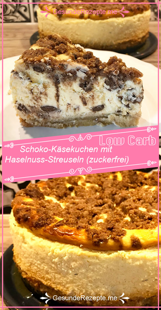 Für die Füllung den Frischkäse mit dem Erythrit und dem Schmand glatt rühren. Die Eier einzeln hinzugeben und gut unterrühren. Die Schokostreusel unterheben. Die Masse auf den Boden geben. Für die Streusel alle Zutaten krümelig verkneten und auf den Kuchen streuen. Im vorgeheizten Backofen bei 160 Grad ca 65 Minuten backen. Die Ofentür öffnen und den Kuchen abkühlen lassen. Bis zum Verzehr im Kühlschrank lagern.