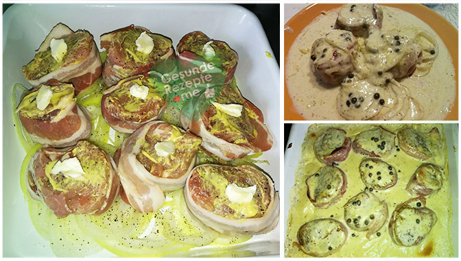 Backofen bei 175 ° Umluft vorheizen. Zwiebel schälen und in Ringe schneiden. Eine ofenfeste Form leicht fetten, Zwiebeln darin verteilen. Medaillons trocken tupfen und mit je 1 Scheibe Speck umwickeln. Von beiden Seiten mit Senf bestreichen und auf die Zwiebeln legen. Butter in Flöckchen daraufgeben. Im heißen Ofen ca 40. Min. braten.Für die Sosse Sahne, Frischkäse, Schmelzkäse und Pfefferkörner in einen Topf geben und ca. 8 Min köcheln lassen.Sosse ca. 10 Min. vor Ende der Fleischgarzeit über die Medaillons geben.