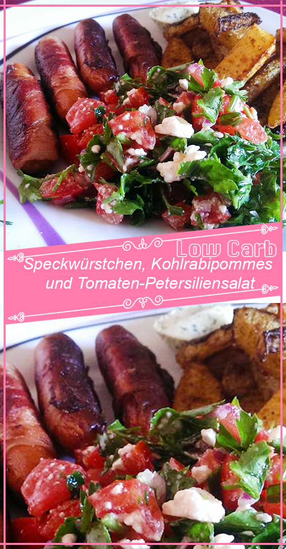 Speckwürstchen, Kohlrabipommes und Tomaten-Petersiliensalat