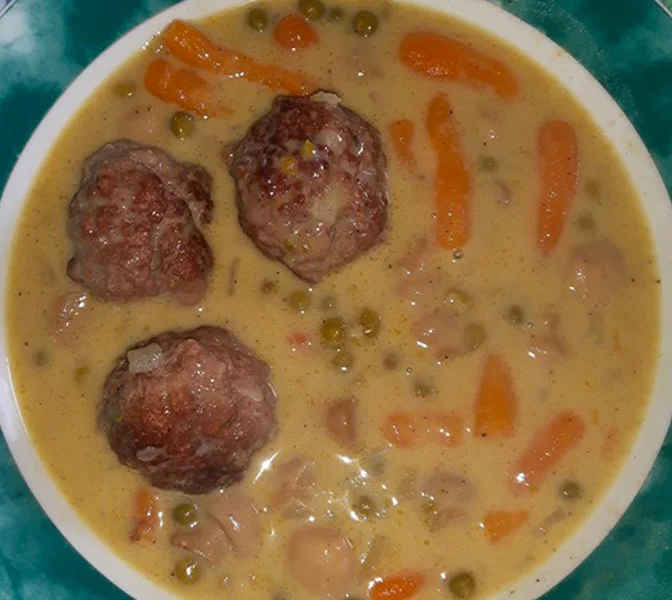 Hackfleisch würzen und Bällchen formen, in Olivenöl anbraten. In einem Topf die Zwiebeln dünsten und dann das Gemüse/Pilze dazugeben. Mit der Brühe auffüllen und die Hackbällchen dazugeben. Dann etwas köcheln lassen. Zum Schluss die Sahne dazugeben und nochmal würzen.