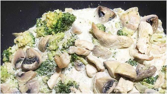 Nun die Sahne und den Frischkäse zugeben. Sobald der Frischkäse geschmolzen ist, das Fleisch und die Champions zum Brokkoli geben und heiß werden lassen. Evtl. nochmals abschmecken. Zum Schluss den klein geschnitten Feta-Käse dazugeben und schmelzen lassen.